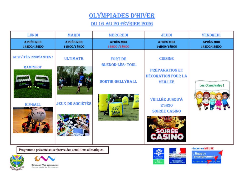 Prochain centre Evasion Ados, du 16 au 20 février 2026 à la Salle des Fêtes de Lérouville. Les inscriptions s’effectuent en mairie de Lérouville du 02/02/2026 au 13/02/2026.