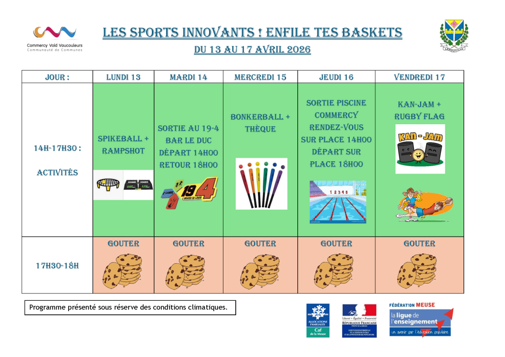 Prochain centre Evasion Ados, du 13 au 17 avril 2026 à la Salle des Fêtes de Lérouville. Les inscriptions s’effectuent en mairie de Lérouville du 02/04/2026 au 10/04/2026.