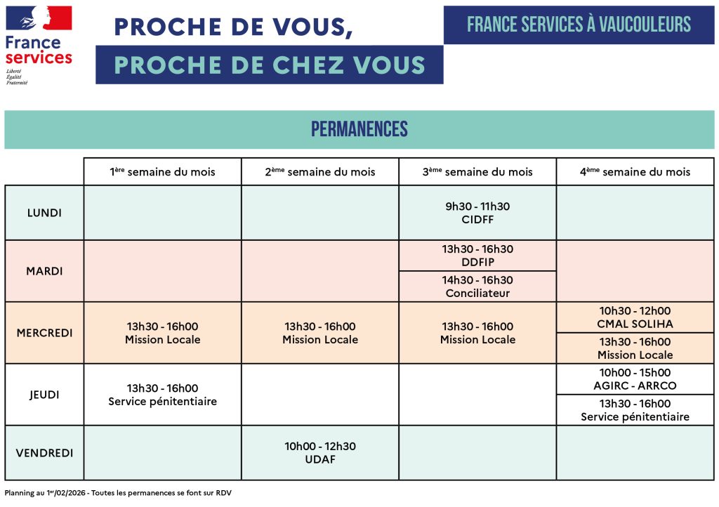 Retrouvez ci-dessous le planning des différentes permanences proposées par France Services à Vaucouleurs :