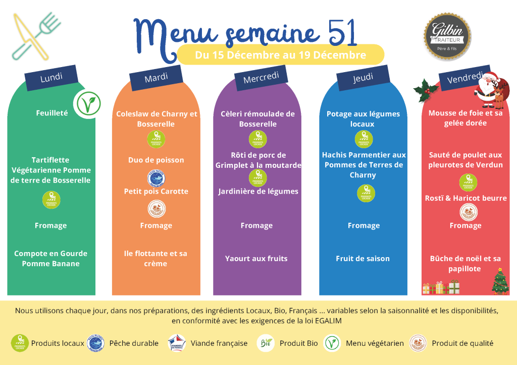 Les repas de vos enfants sont fournis à la Communauté de Communes par Gilbin traiteur. Vous pourrez trouver ici chaque semaine les prochains menus.
