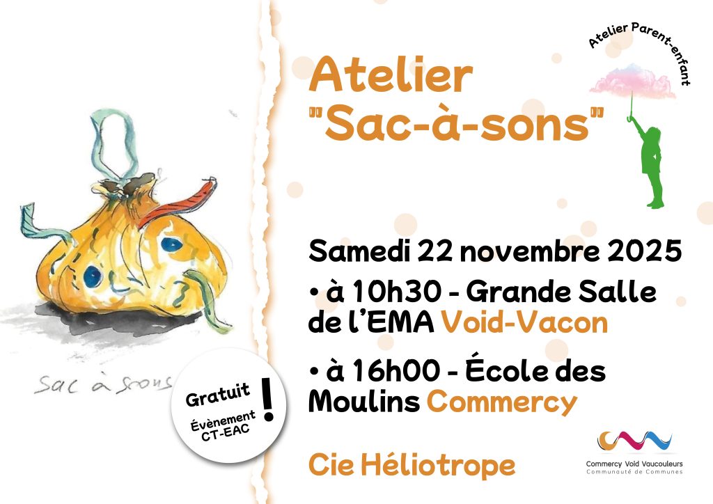 Atelier parent-enfant « sac-à-sons » – Atelier autour du spectacle “Les p’tites saisons”, avec les deux artistes de la Compagnie Héliotrope.
